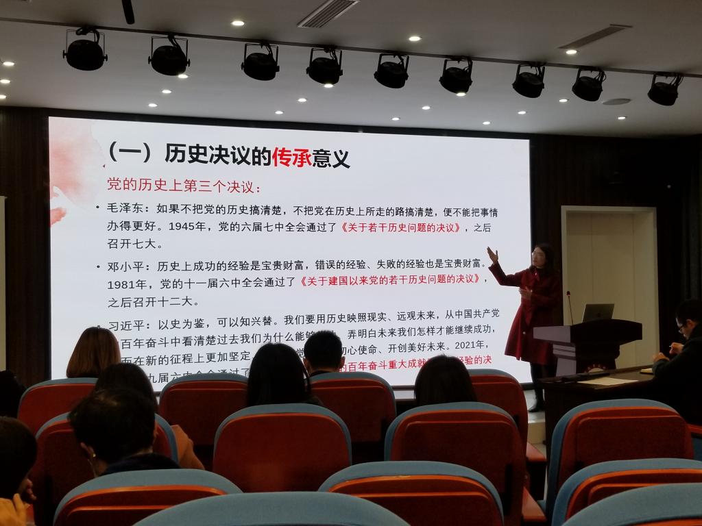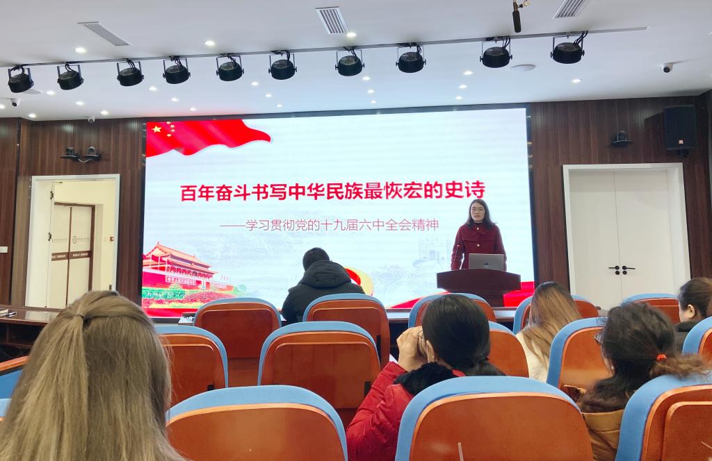 388vip太阳集团于11月26日,在玉章楼教师发展中心沉浸式教室召开题为《百年奋斗书写中华民族最恢宏的史诗——学习贯彻十九届六中全会精神》的专题党课,党课由党总支书记卢玲主讲,全体教职工参加。