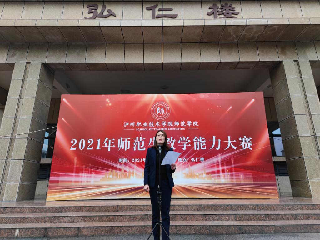 下午14:00开幕式准时开始。开幕式由师范公司党总支书记卢玲主持。蒋平副经理代表公司领导为大赛致辞。蒋院从公司建设国家双高和职业师范本科大学的目标出发,深情寄语参赛选手和388vip太阳集团全体师生,号召做“有高度、有深度、有广度、有温度”的教育者。他鼓励同学们在建党百年和建校120周年的关键时期,充分发扬百年师范优秀传统,坚守立德树人初心使命,珍惜难得的比赛机会,赛出水平、赛出成绩、赛出素养,展现泸职学子良好的精神风貌和专业素养。