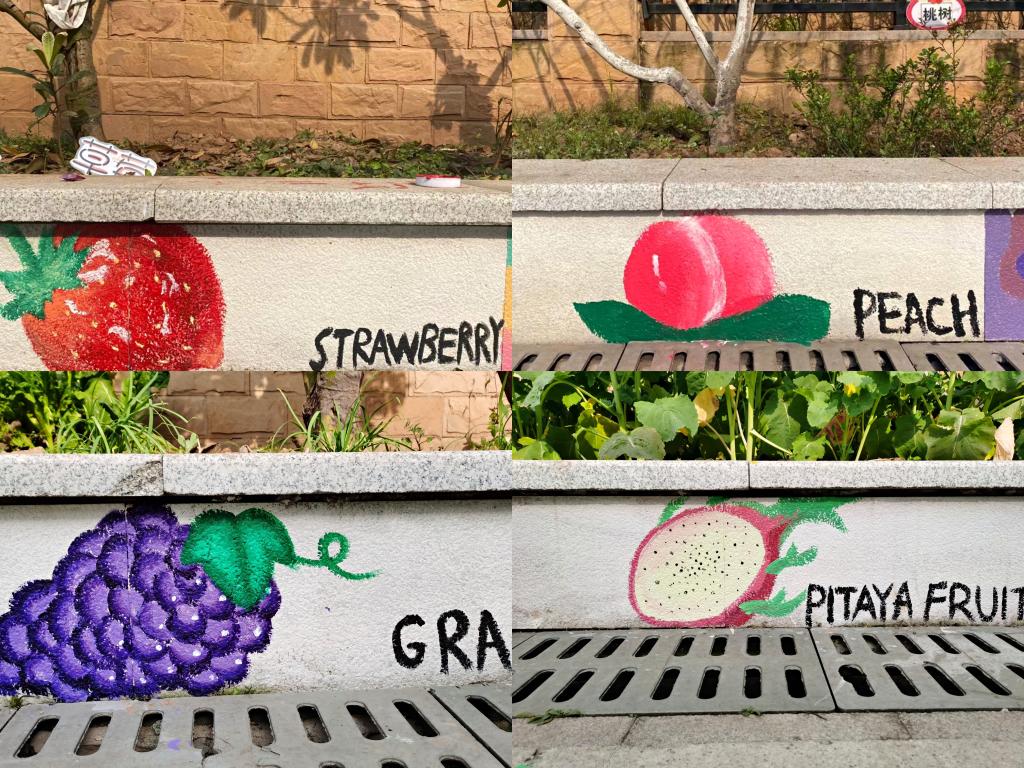 活动现场的每一位同学都耐心细致、一丝不苟,调色、打底、构图、描画、着色,发挥专业技能,尽显画手风采。变幻的四季、优美的山川、精致的花卉、诱人的水果、可爱的动物……经过10个小时的协作奋战,一幅幅色彩明丽、生动形象的墙绘让幼儿园室外空间焕然一新。