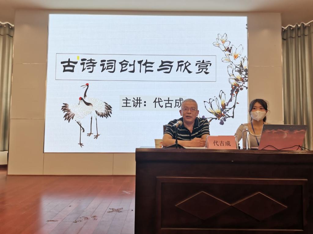 代古成老师结合自身多年的教学和研究经历,围绕古诗词的基础知识、古诗词的创作与修改、优秀作品欣赏三个方面开展讲座。他从字数、句数、音律和押韵四个方面对格律诗的四种基本格式:五绝、七绝、五律和七律进行讲解,以《送友人》、《客至》等诗歌为例,讲解创作技巧,引导同学们理解诗歌的意境。最后,他还通过现场交流互动,热心解答同学们的疑问,为同学们的古诗词创作明确了方向。