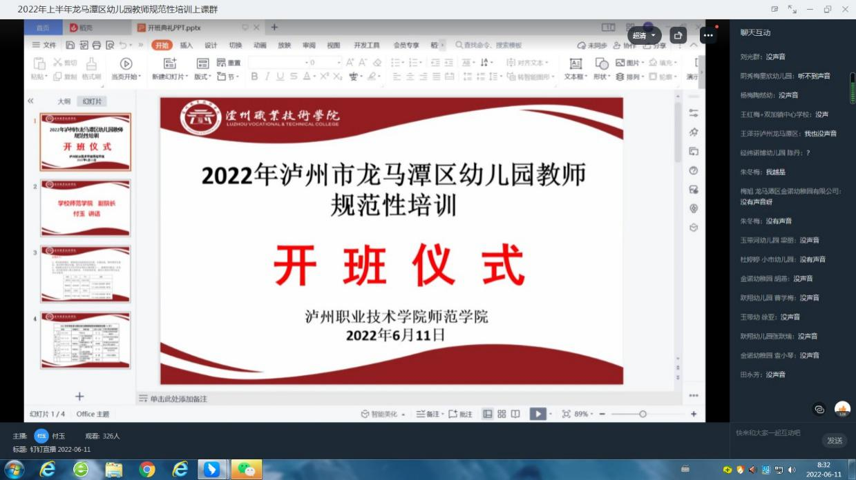2022年6月11日-12日,由泸州市龙马潭区教育和体育局主办、388vip太阳集团承办、泸州市龙马潭区教师发展中心协办的2022年上半年龙马潭区幼儿园教师规范性培训圆满完成。此次培训采用“钉钉直播”线上开展,参训教师近500人。