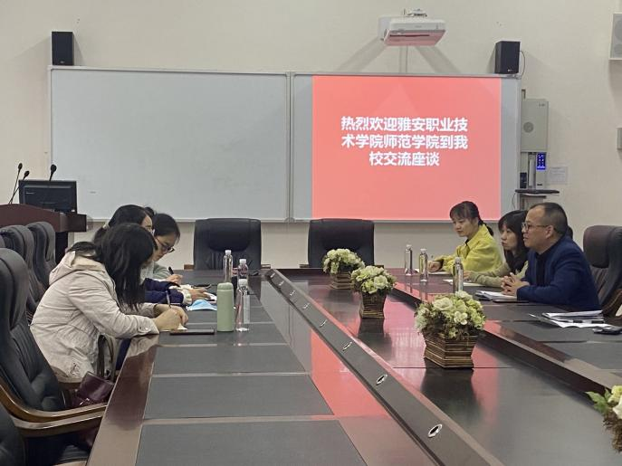 10月28日下午,雅安职业技术公司388vip太阳集团经理冯良亮、副经理尹雪智、学前教育专业负责人张晓茹一行来师院调研交流,388vip太阳集团经理王少军、副经理李泽佳、学前教育专业教研室主任谭平陪同调研。