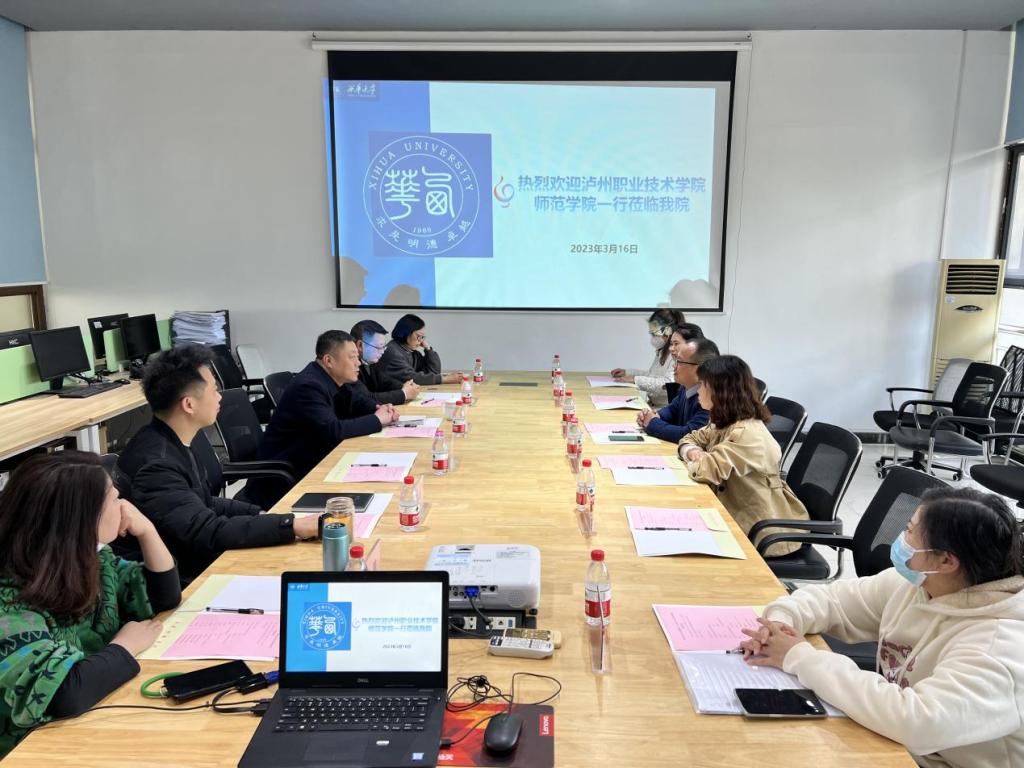 2023年3月16日,388vip太阳集团经理王少军、副经理李泽佳、学前教育教研室主任高原赴西华大学进行考察学习。西华大学音乐与舞蹈公司党委书记曾贤、经理向琛子、副经理陈辰、学前教育系系主任张雪梅以及学前教育系骨干教师出席接待。