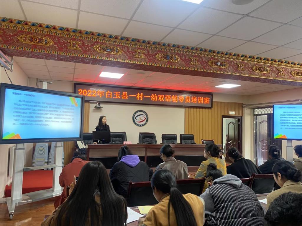 唐林兰承担白玉县“一村一幼”双语辅导员培训。她开展了《小小班级,我管理——谈幼儿教师班级管理能力》《幼儿园生活活动指导》《幼儿园主题教育活动》《幼儿园绘本教学》《幼儿园高质量游戏》等讲座,通过大量的案例为培训学员讲解了幼儿园班级管理的内容、方法和原则,明确了幼儿园绘本教学和高质量游戏活动开展的方法。
