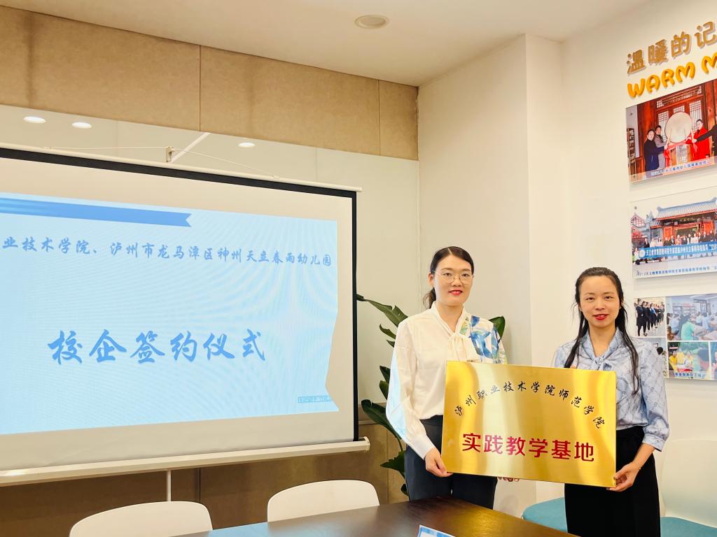 5月18日下午,师范公司党总支书记卢玲、副经理付玉、实训主任吕超荣一行前往泸州市龙马潭区神州天立春雨幼儿园有限公司商洽校企合作事宜并签订校企合作协议。天立春雨幼儿园园长张丽婷及其团队进行了热情的接待。
