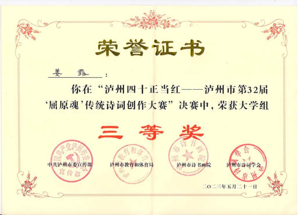 公司学子囊括泸州市第32届“屈原魂”传统诗词创作大赛决赛大学组一半奖项