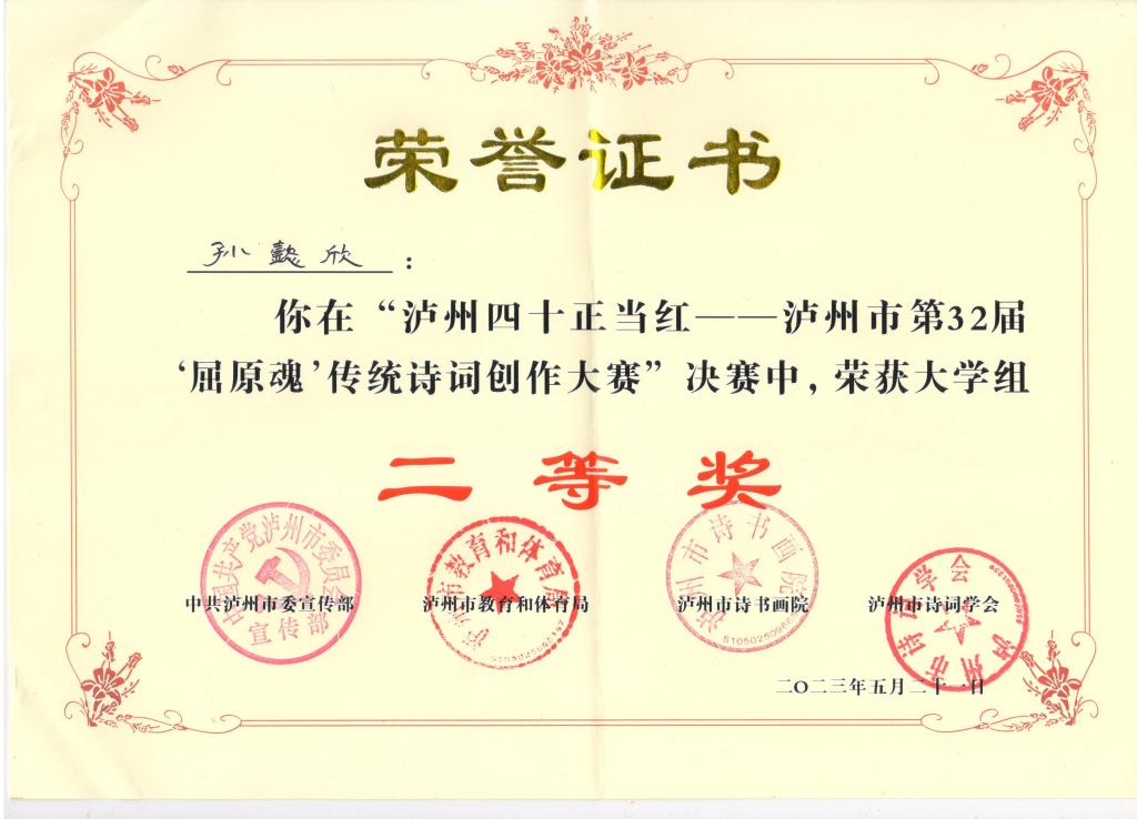5月21日,主题为“泸州四十正当红”的泸州市第32届“屈原魂”传统诗词创作大赛决赛在泸州一中举行。公司孙懿欣同学在决赛中荣获大学组二等奖,姜露、周灵萱两位同学荣获大学组三等奖。决赛大学组总共只设6个获奖名额,其中一等奖一名、二等奖两名、三等奖三名。公司学子囊括决赛大学组一半奖项。