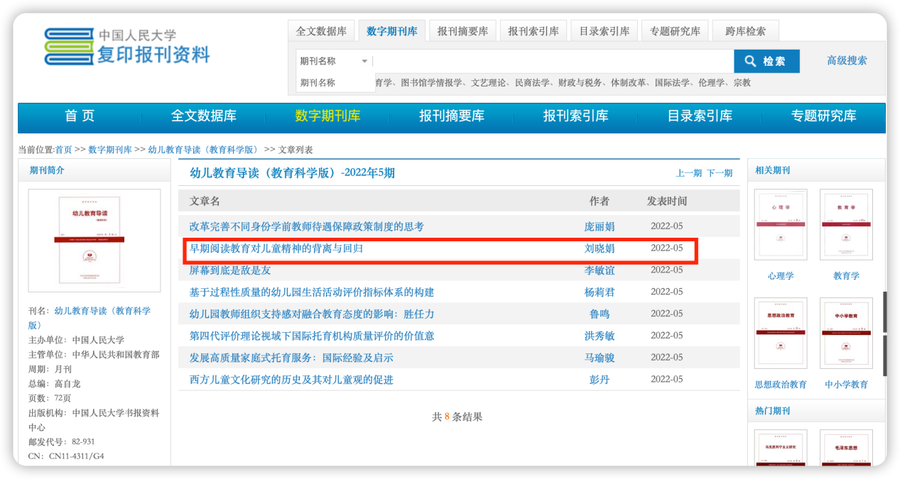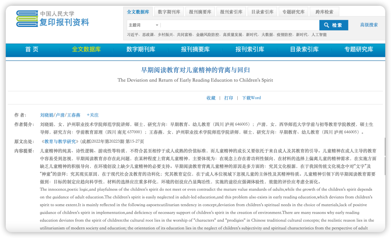 近日,从中国人民大学复印报刊资料数据库获悉,公司388vip太阳集团刘晓娟、王春燕老师撰写的论文《早期阅读教育对儿童精神的背离与回归》(原载《教育与教学研究》2022年第3期)被中国人民大学书报资料中心复印报刊资料《幼儿教育导读(教育科学版)》2022年第5期全文转载。
