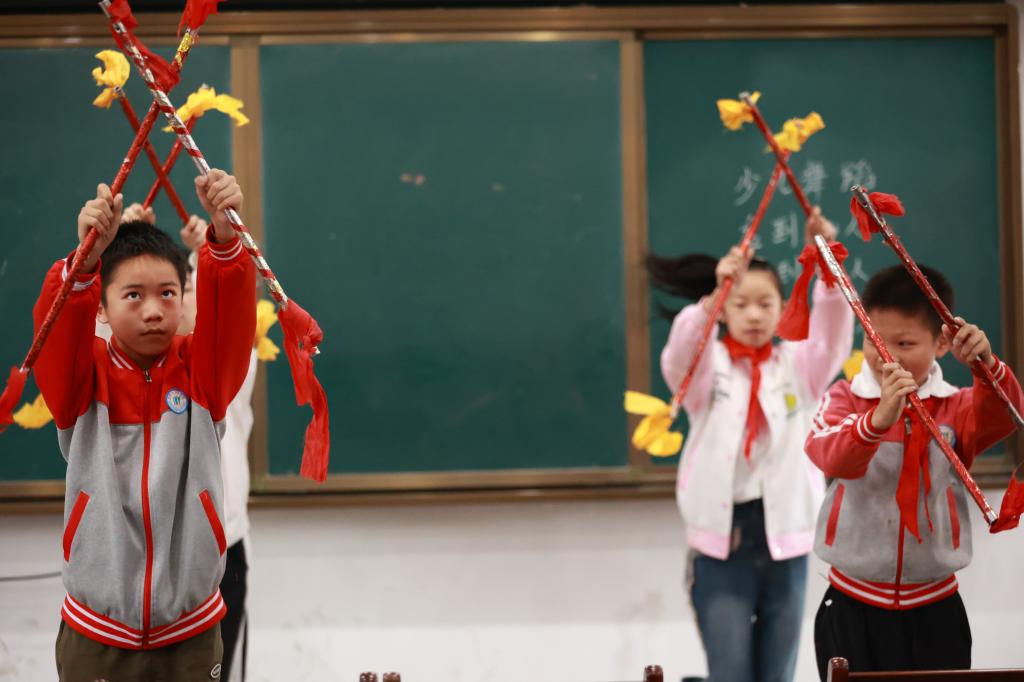 百和中心小学德育主任杨杰介绍道具制作过程