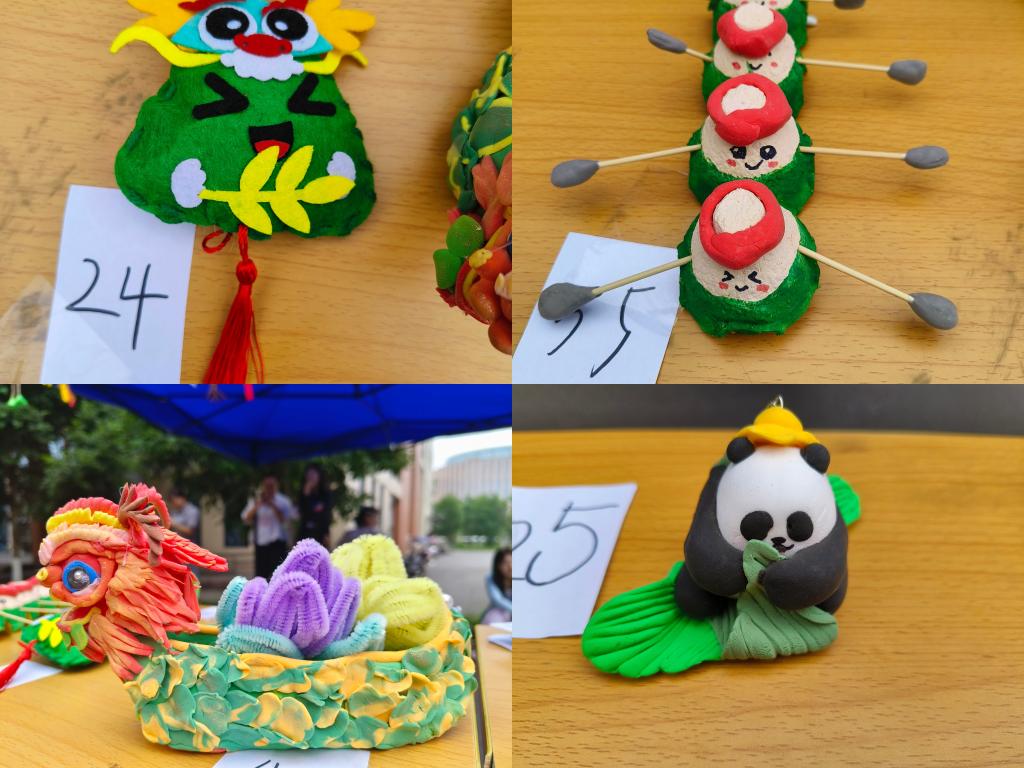 彩布缝合,细线打结,一个个手工挂件玲珑小巧、立体饱满、造型独特,每个立体粽子挂件和龙舟摆件作品都精妙绝伦。一针一线的缝合让同学们感受到中华优秀传统文化的魅力,体验到动手的乐趣,也增强了对中华优秀传统文化的认同感与自豪感。精巧的挂件吸引了众多目光,让同学们爱不释手。