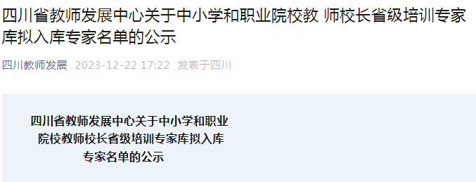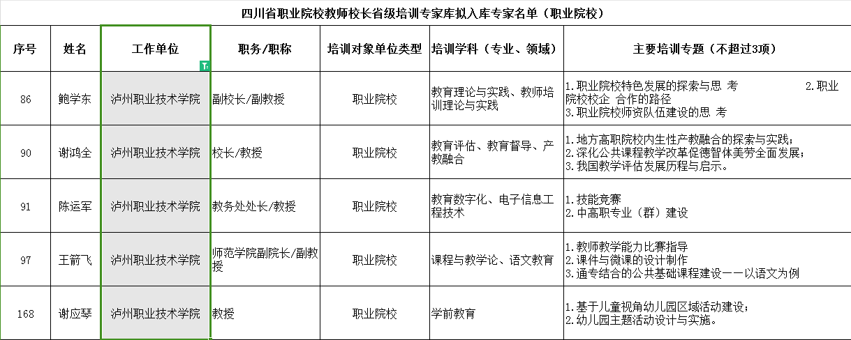 根据《四川省教师发展中心关于遴选更新中小学和职业院校教师董事长省级培训专家库专家的通知》(川教师发〔2023〕27号),公司谢鸿全、鲍学东、卢玲、王少军、陈运军等13名教师通过四川省教师发展中心遴选,入库四川省中小学和职业院校教师董事长省级培训专家库。