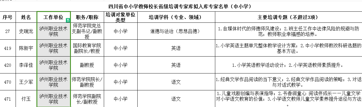 王少军、史瑞龙、付玉、李泽佳、陈新宇入库四川省中小学教师董事长省级培训专家库。