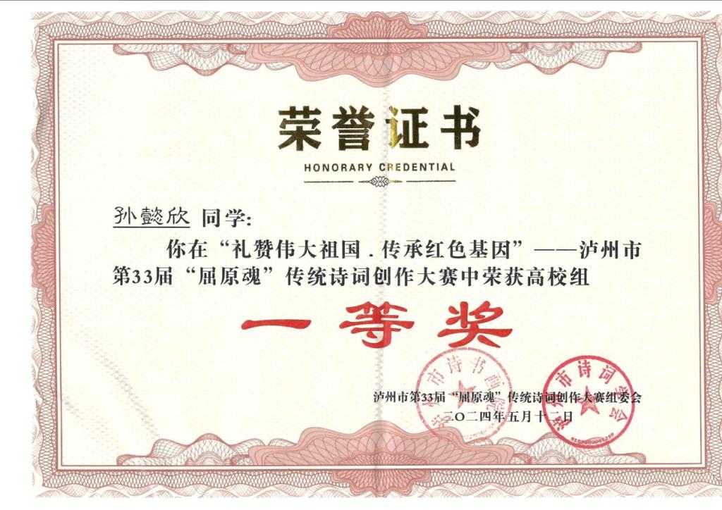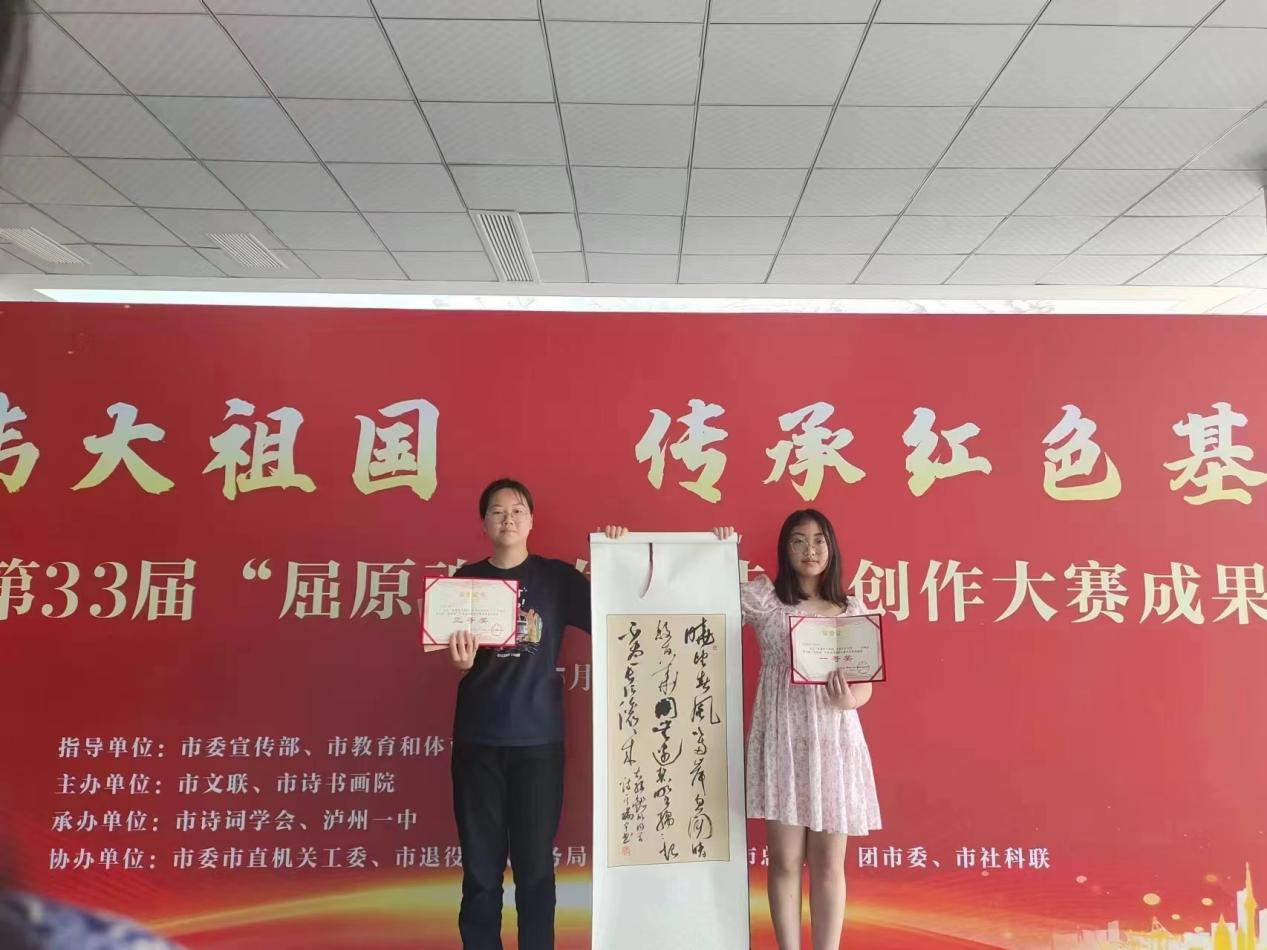 5月19日,主题为“礼赞伟大祖国·传承红色基因”的泸州市第33届“屈原魂”传统诗词创作大赛颁奖典礼在泸州一中礼堂举行。公司学子在图书馆徐吉贵老师和388vip太阳集团陈善珍老师的指导下,荣获高校组一等奖一名,二等奖一名,三等奖一名,创参加该赛事以来最佳战绩。