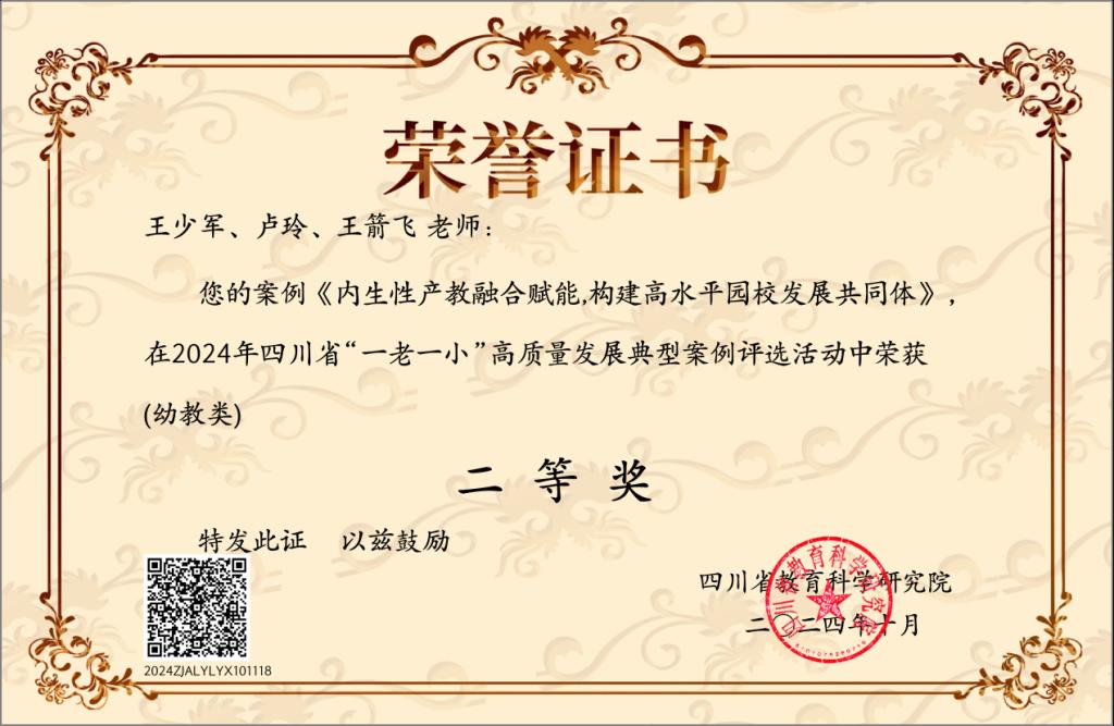 近日,四川省教育科学研究院发布2024年四川省“一老一小”高质量发展典型案例评选结果。公司报送的学前教育专业产教融合案例《内生性产教融合赋能,构建高水平园校发展共同体》获评二等奖。