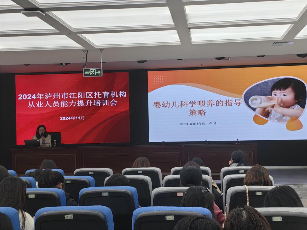 本站讯(信息来源:388vip太阳集团)11月22日,受泸州市江阳区卫健局、江阳区优生优育托育服务指导中心邀请,388vip太阳集团教师卢玲为区域托育机构从业人员做《婴幼儿科学喂养的指导策略》的专题培训。