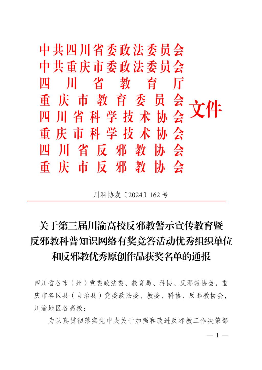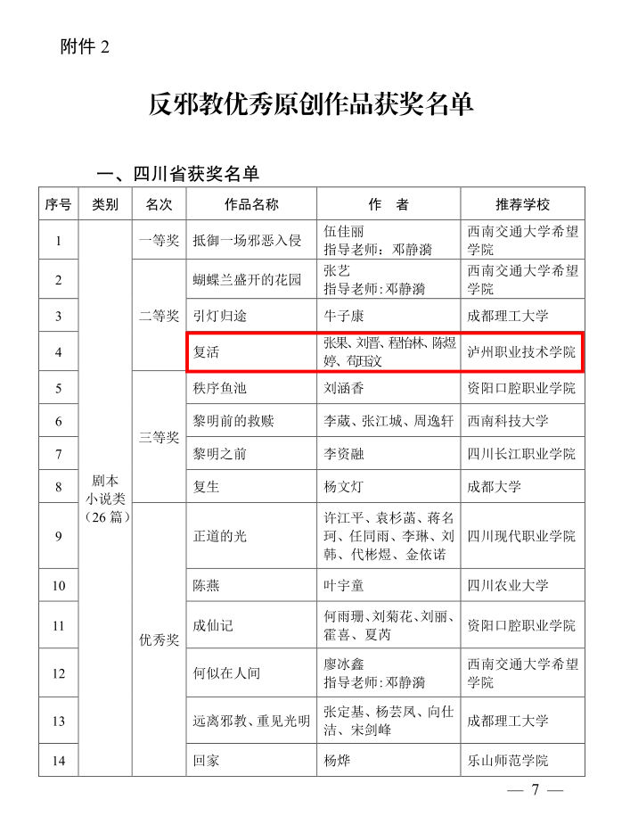 公司员工完成的剧本小说《复活》在第三届川渝高校反邪教警示宣传教育活动中获优秀原创作品二等奖。