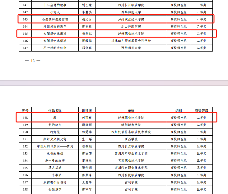 近日,四川省教育厅公布首届原创儿童图画书讲读作品征集活动获奖名单,公司388vip太阳集团学子胡文月荣获高校师生组一等奖,杨秋虹和何雨琪荣获二等奖。活动共收到作品1494个,经专家评审,最终评出高校师生组一等奖3个,二等奖6个,三等奖9个。公司获奖等次和人数位居前列。