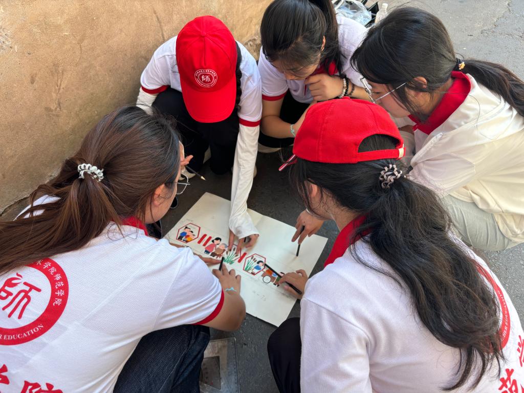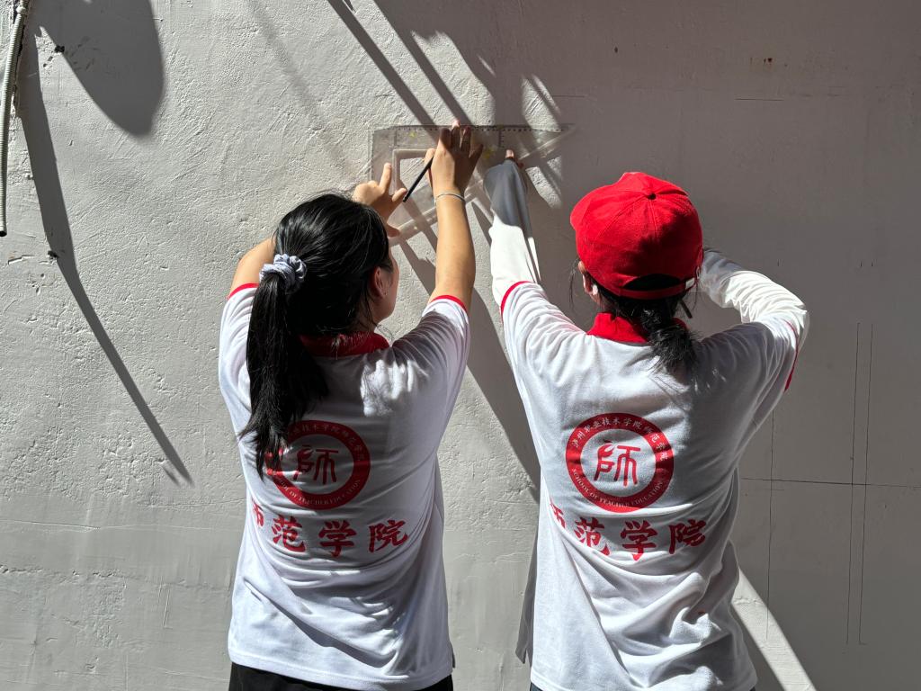 随后,团队分工协作,一部分队员实地勘测墙绘面积、调配颜料、勾勒图案轮廓;另一部分队员深入街巷、宣传推普;剩余成员在安溪社区党群服务中心组织儿童及家长,开展推普支教课堂活动的预约报名。各环节衔接紧密、高效推进,为活动开展筑牢根基。