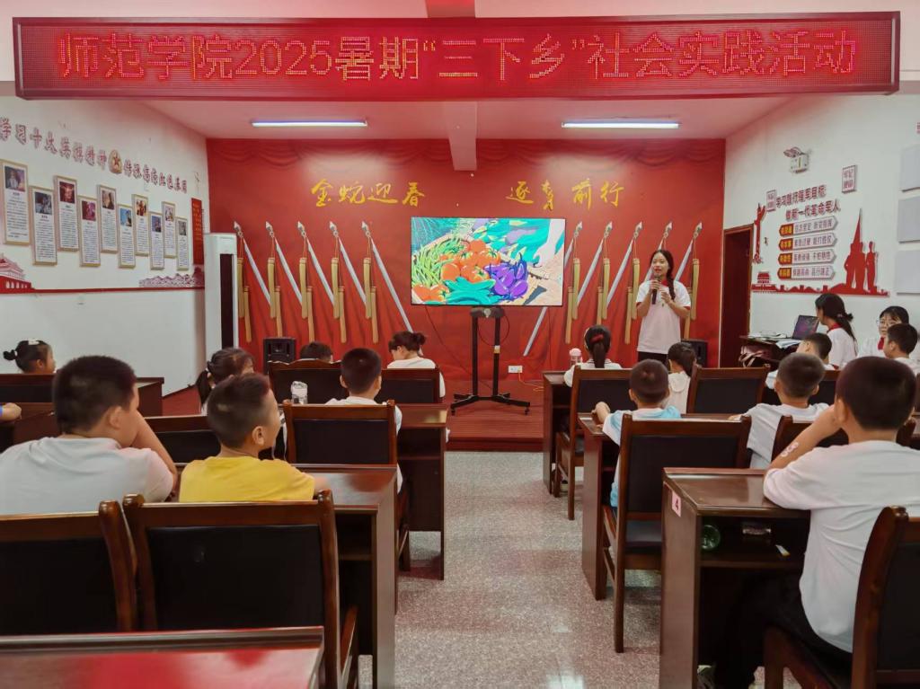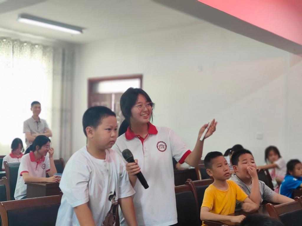 实践队以推普教学为核心,设计丰富多样的互动游戏。在欢快的节奏中,“对不起,没关系……”“太阳公公早上好,小鸟叽叽喳喳叫……”等儿歌响起,小朋友的童声与手势舞相映成趣,生动传递着普通话的魅力。普通话培训巧妙融入绕口令、猜猜乐等趣味游戏,实践队员与小朋友亲切互动,寓教于乐。趣味绘画环节将普通话学习融入创作,小朋友用画笔描绘主题,用普通话讲述画作,提升语言与艺术素养。音乐、语言、绘画多维活动有机联动,共同奏响推普支教的华彩乐章。