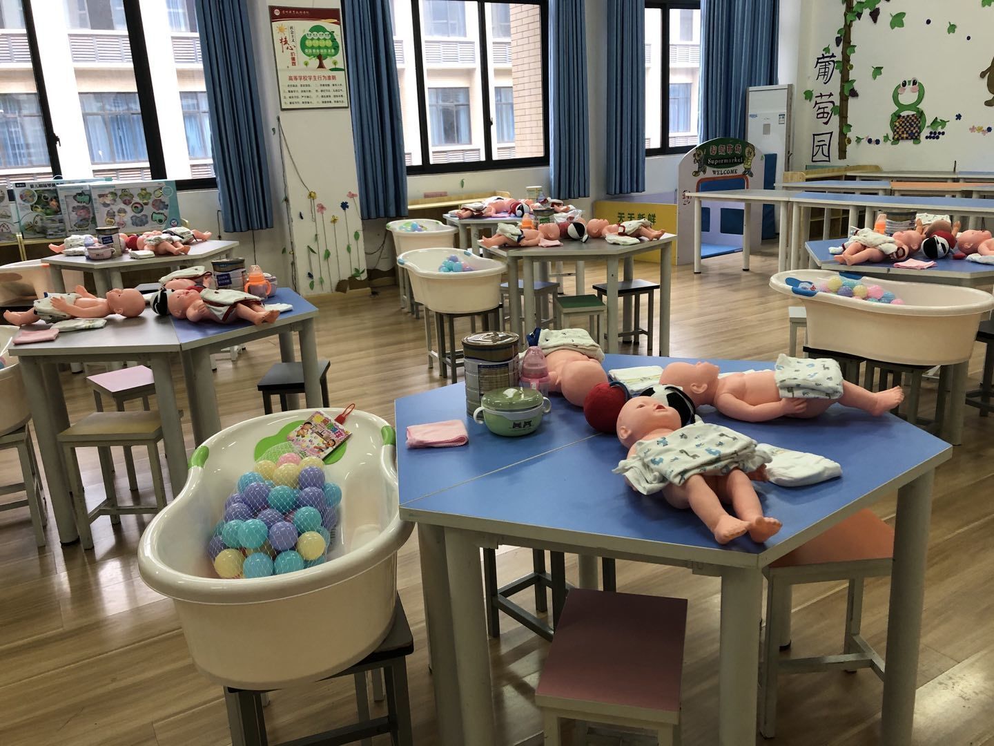 现有校内实训基地建筑面积4000多平方米,校内实训室160余间,现有教师教育专业技能综合训练智慧教室4间,婴儿仿真智慧教室1间,大小微格教室9间,机房及语音综合教室8间,大小琴房120余间,拟新建婴幼儿早期实训室、虚拟幼儿园、婴幼儿卫生保健护理实训室各1间,能充分满足学前教育、早期教育、小学教育、语文教育、英语教育、音乐教育六个师范专业近三千名员工的校内实训教学需要。