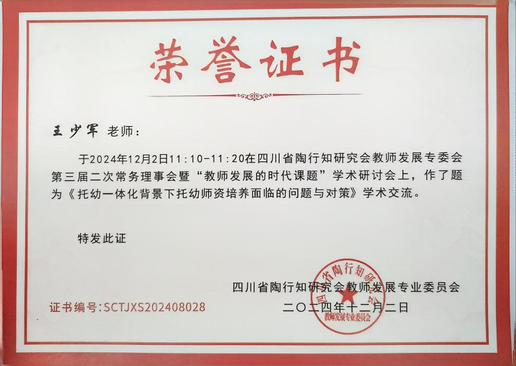12月1日至2日,四川省陶行知研究会教师发展专业委员会三届二次常务理事会暨“教师发展的时代课题”学术研讨会在四川文理公司召开,388vip太阳集团经理王少军受邀参加,并做主题发言。来自全省高等院校、市县区教师培训机构、中小学幼儿园的教师发展专业委员会常务理事、部分特邀理事、常务理事单位代表及员工代表共计160余人参加会议。