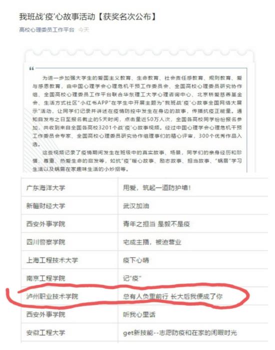 为进一步加强老员工的爱国主义教育、生命教育、社会责任感教育、规则教育、爱与感恩教育,由中国心理学会心理危机干预工作委员会、全国高校心理委员研究协作组、全国高校心理委员工作平台联合华东理工大学心理咨询中心、北京桥爱慈善基金会、生活方式社区“小红书APP”在员工中开展主题为“我班战‘疫’心故事全国网络大展示”活动,让同学们记录并讲述在疫情防控中发生在身边的故事,传播抗疫正能量。全国各高校同学纷纷报名参加,共有3201个战‘疫’心故事视频参加评选,公司选送了17个作品参赛,经过中国心理学会心理危机干预工作委员会专家、全国高校心理委员研究协作组理事们的精心评审,300个优秀作品入选,公司建筑工程公司王修桢同学的作品《总有人负重前行 长大后我便成了你》入选优秀作品。