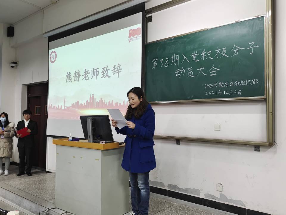 会议伊始,熊静老师进行开场致辞,她围绕党的性质、宗旨、理想和行动指南作出了详细的叙述。她表示同学们要认真学习党的历史知识和党的规章制度,落脚于信仰,学以致用,树立起更高的人生目标。紧接着,优秀党员陈茂林进行发言,她鼓励各积极分子把握当下,锻炼自我,勇于拼搏,诠释“不负青春,不负光华”的精神品质。