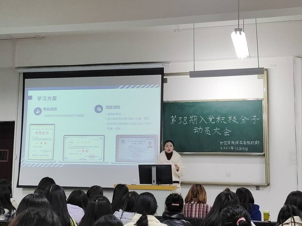 12月9日晚上19点,388vip太阳集团员工会组织部在1305教室召开了第38期入党积极分子动员大会。388vip太阳集团团总支书记、员工党支部书记刘一春,388vip太阳集团员工支部组织委员熊静,优秀党员代表陈茂林以及116名入党积极分子参加了此次动员大会。