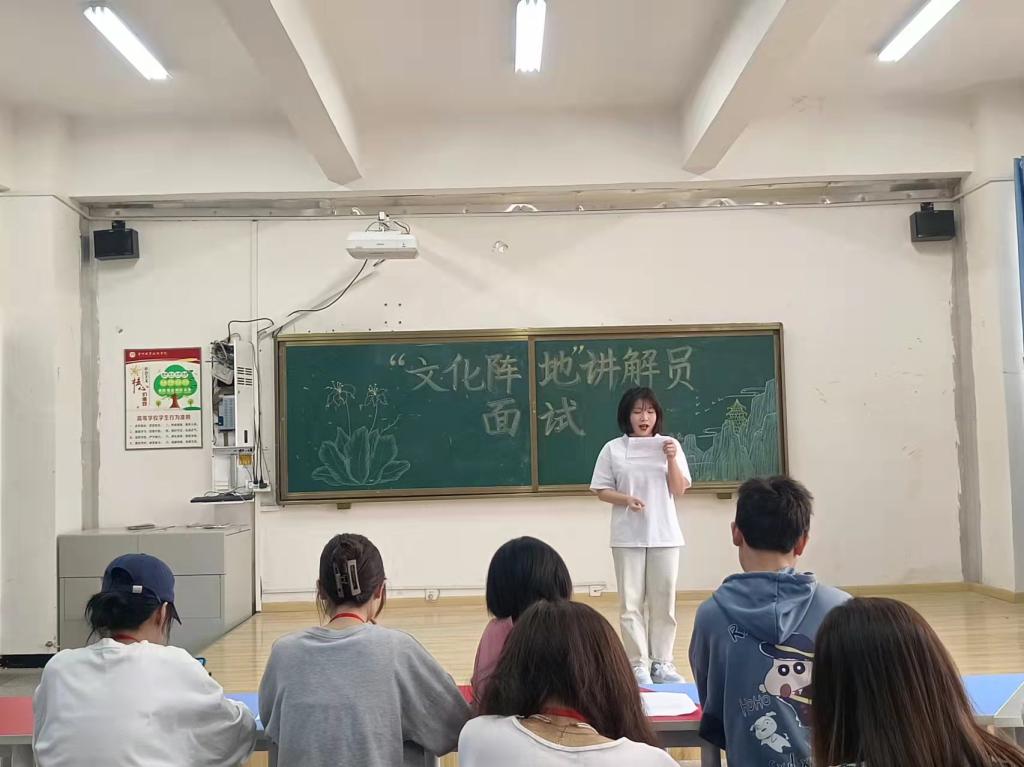 面试前,选手们在侯场室调整好心态,练嗓开声,熟悉讲解内容,做好充分的准备。面试开始,主持人宣读评分细则并宣布面试内容。随后,选手们依次上台进行演讲。面试过程中,选手们举止落落大方,语言表达自然流利,真切表达了他们自觉传承红色文化的信念和决心。面试最后,评委团采取现场打分制原则对选手们的表现进行打分,保证面试公开、公平、公正,最终评选出10位表现优异的选手成为本次“文化阵地”的讲解员。
