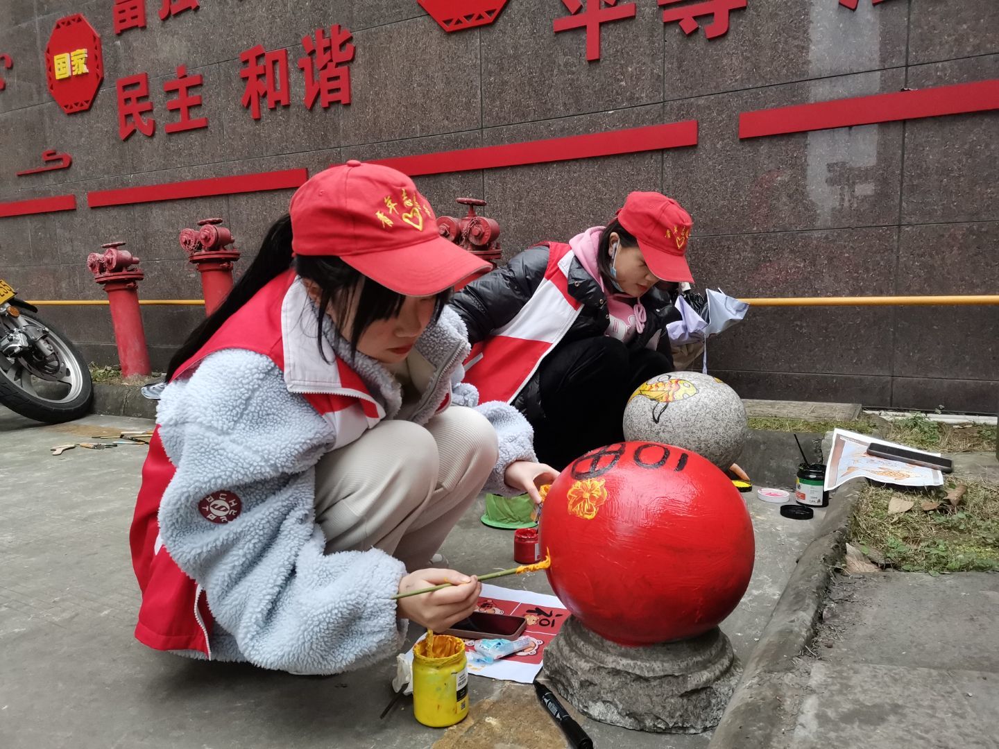 7日下午,王少军经理、梁静老师带队前往云台社区,与书法协会老师们共同开展志愿服务活动。志愿者有的负责磨墨、协助老师书写福字和春联,有的协助社区清理垃圾。画意未来志愿服务队拿起手中画笔,对社区石墩进行绘画装饰,为社区增添色彩。红彤彤的春联、喜庆的福字和栩栩如生的石墩绘画,让社区焕然一新,增添了不少年味。