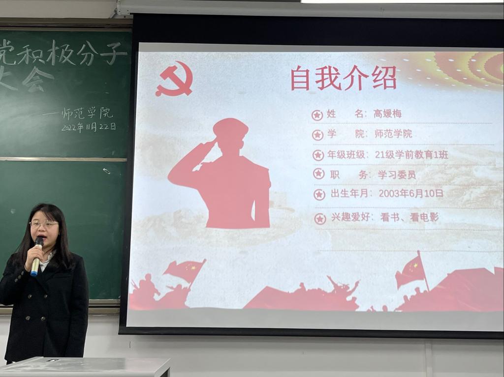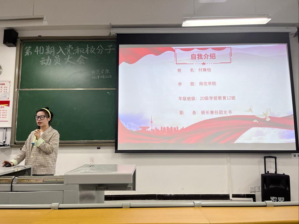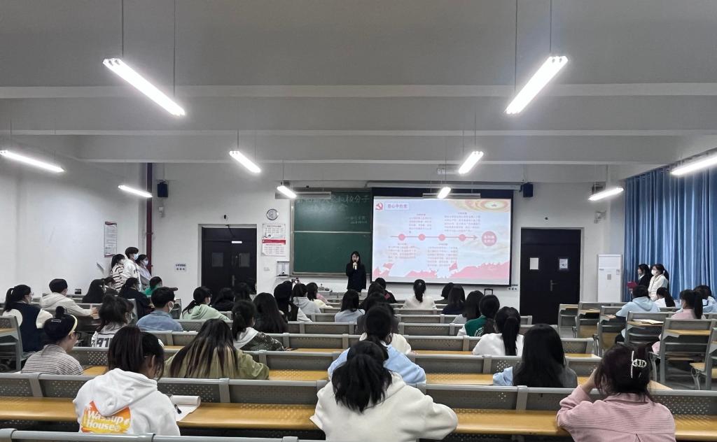 会上,王端端从学习党的二十大精神、习近平新时代中国特色社会主义思想以及实现中华民族伟大复兴的中国梦三个方面展开了细致地讲解。随后,党员代表付琳怡和第40期入党积极分子代表高媛梅依次上台发言,她们以自己的成长历程为例,分享对党的心得体会,并介绍了党的光荣历史和发展历程等党的相关知识。最后,熊静对在场入党积极分子提出了殷切期望,希望同学们端正入党动机,积极向党组织靠拢,发挥模范带头作用,不断提升自身综合素质。