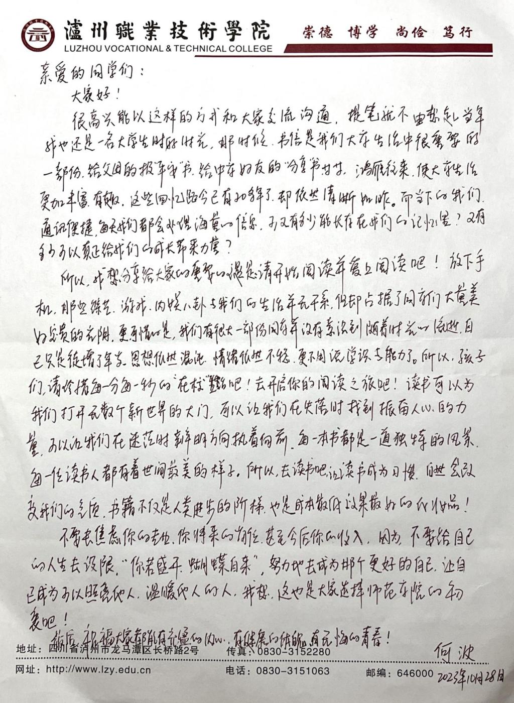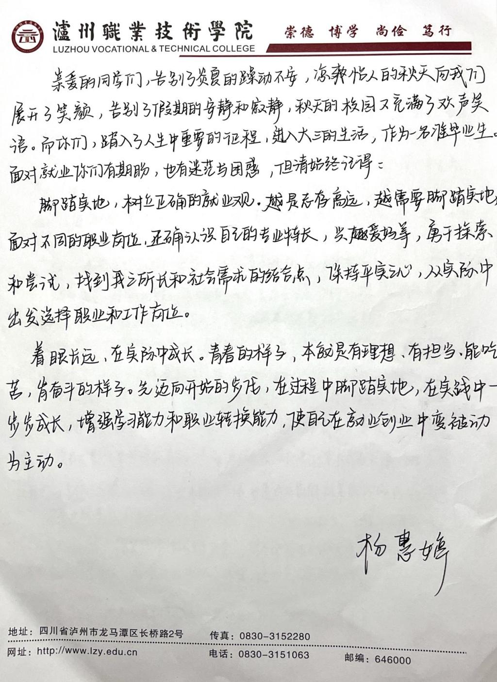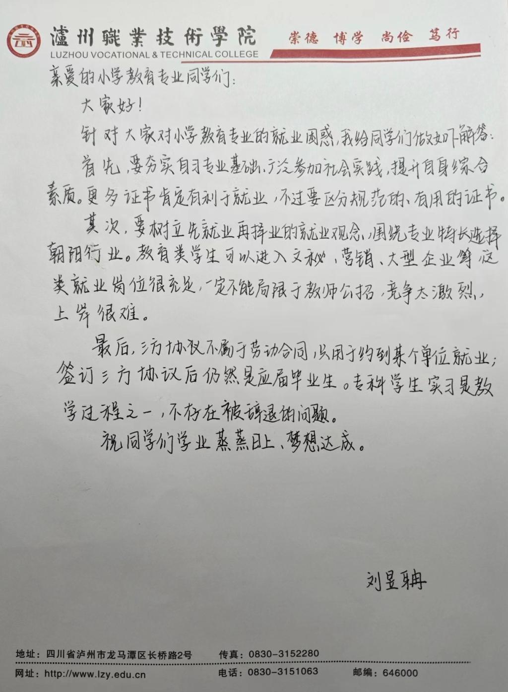 本站讯(信息来源:388vip太阳集团)近日,388vip太阳集团结合同学们在学习、生活、就业、素质能力提升等方面的困惑,以教师书信答疑的方式组织开展“杏坛来鸿”活动,旨在架起师生思想沟通与交流的桥梁,及时为员工成长成才做好服务。
