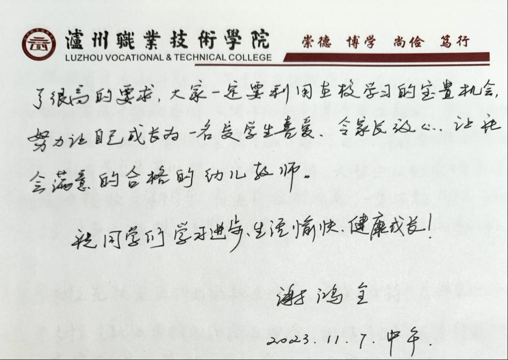 其中,谢鸿全经理希望学前教育专业员工把握在校学习时间,注重自我专业水平的不断提高。