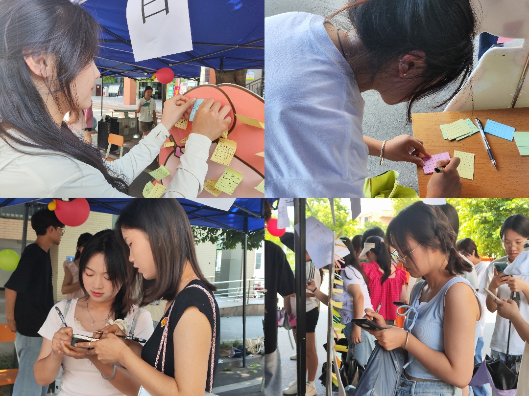 活动当天,第二课堂成绩管理部提前借取人形立牌与便利贴等物资并进行现场布置。在活动中,同学们通过撕下人形立牌上自身存在的负能量标签,再写下自己最真挚美好的祝福以及正能量的话语,将其粘贴在“开心”人形立牌上。简单的“一撕一贴”对应了同学们心态的转变,帮助大家更好地认识自己,摆脱标签,减少内耗。活动接近尾声时,同学们鼓励与温暖的话语填满了人形立牌,汇成一股股暖流,缓缓流淌在每个人的心中。