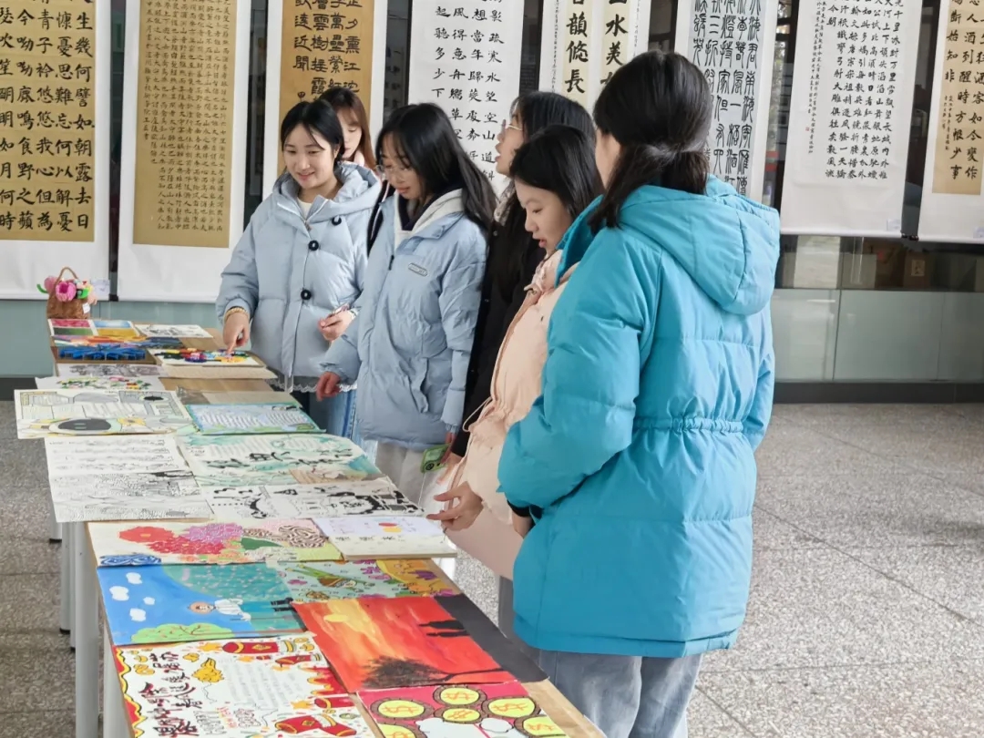 活动期间,同学们积极参与,充分发挥专业特色,精心准备书法、绘画和各类手工作品。这些作品经评选后,在弘仁楼一楼大厅进行展出。活动现场,各类作品琳琅满目,令人目不暇接。书法作品以其行云流水般的笔触,展现出同学们扎实的书法功底和对传统文化的热爱;绘画作品则以其色彩斑斓的画面,充满创意与想象力,让人眼前一亮;手工作品更是独具匠心,从精致的剪纸到栩栩如生的手工艺品,每一件作品都蕴含着同学们的智慧与耐心,展现师范学子深厚扎实的专业技能功底。