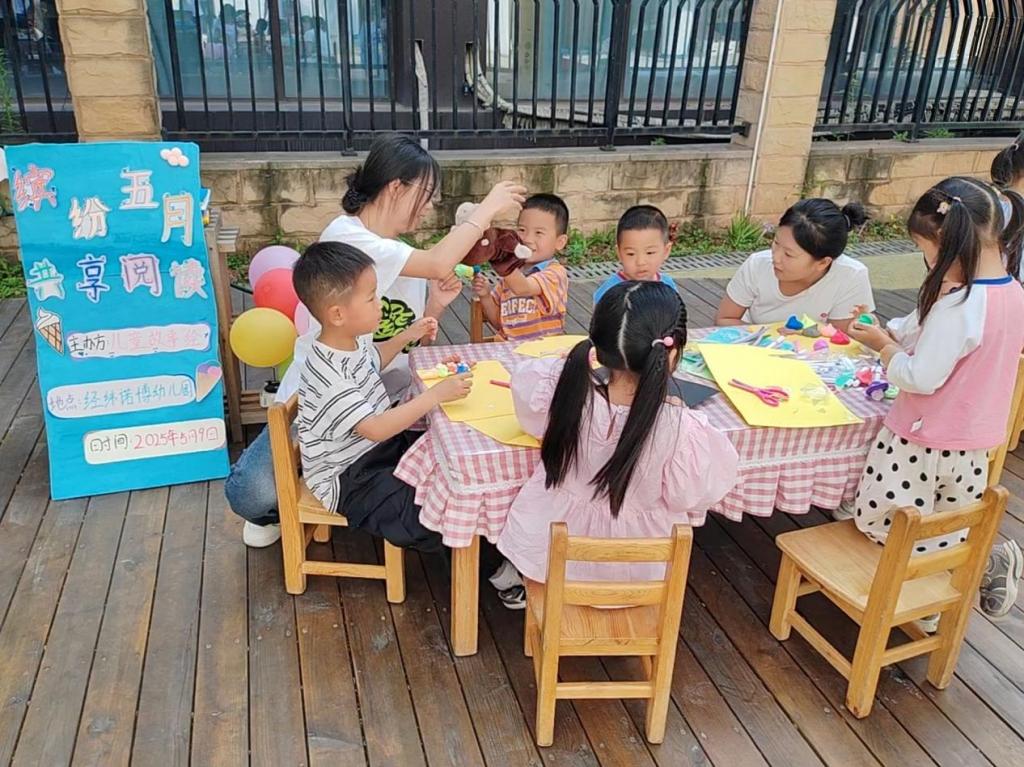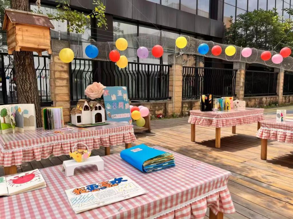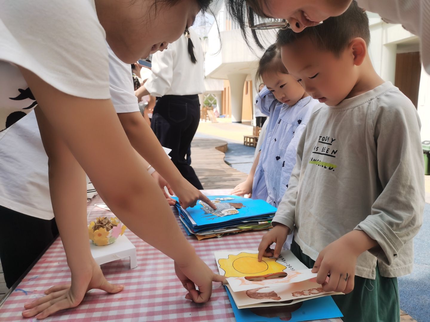 幼儿园户外表演区被布置成色彩斑斓的绘本和手工作品展区,瞬间激发孩子们参与的积极性和探索欲。幼儿迫不及待地参观以及体验“大哥哥大姐姐们”带来的手工艺品和原创故事,热情地与社团成员交流与互动。