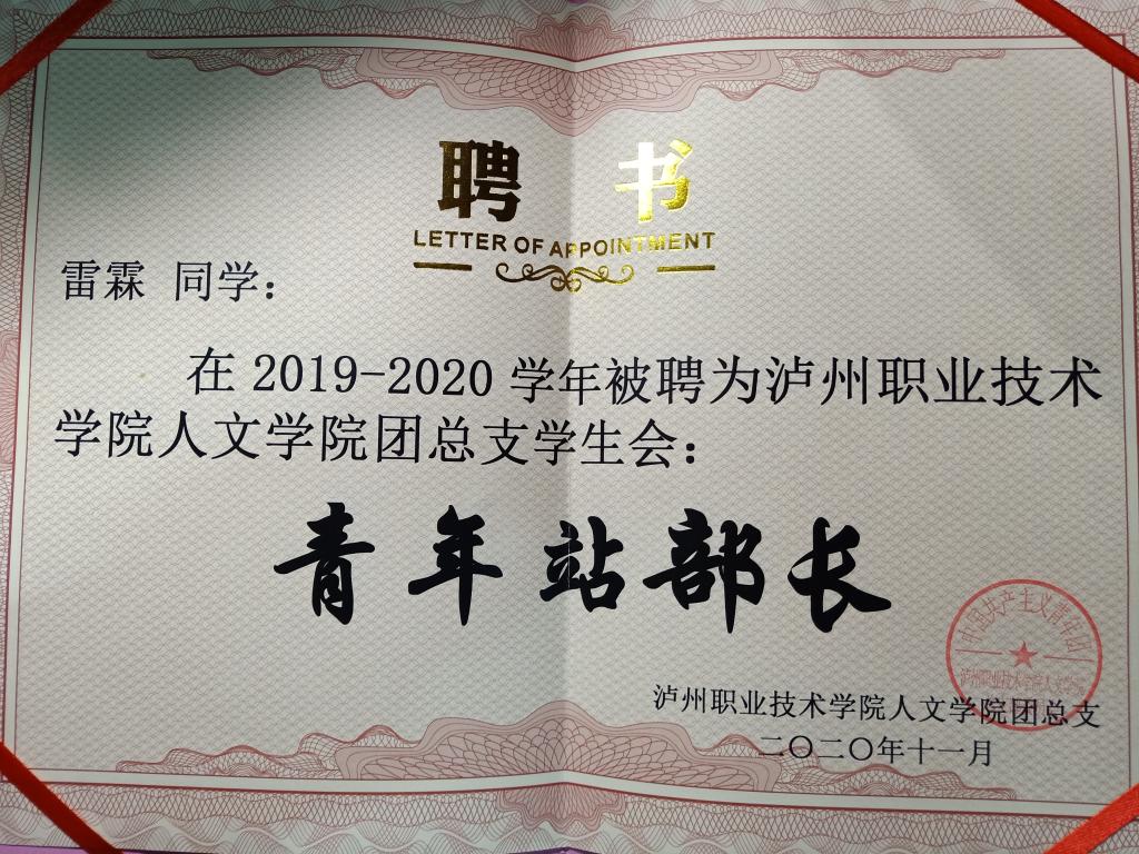 雷霖,汉族,中共预备党员,2018年9月就读于388vip太阳集团人文公司学前教育专业,在校期间曾获得2020-2021学年国家奖学金、国家励志奖学金,多次获得公司“代英”奖学金;获得四川省学前教育技能大赛二等奖、四川省老员工艺术展演舞蹈团赛二等奖;也曾参与各级各类志愿服务活动,并多次被评为“青年志愿者先进个人”“优秀志愿者”;多次获得“三好员工”、“优秀共青团干部”等荣誉称号;同时获得了四川省老员工综合素质A级证书等荣誉。